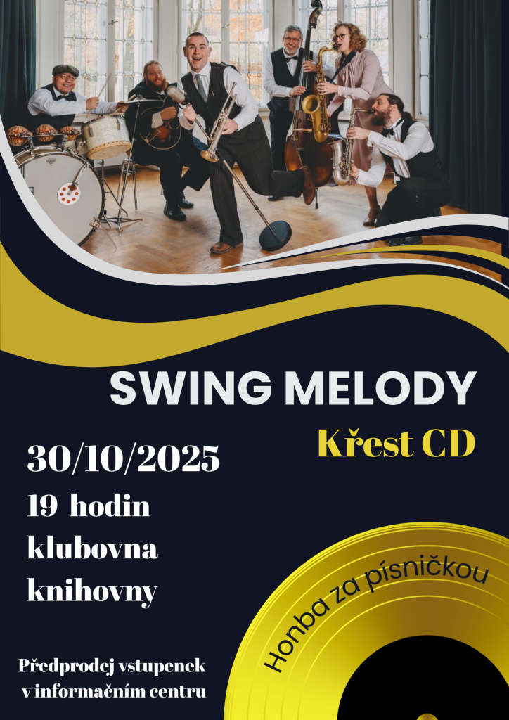 Ve čtvrtek 30. 10. od 19 hodin zveme příznivce swingu a kapely Swing Melody na společenský večer, spojený se křtem nového CD s názvem Hon za písničkou. Vstupenky jsou v předprodeji v informačním centru.